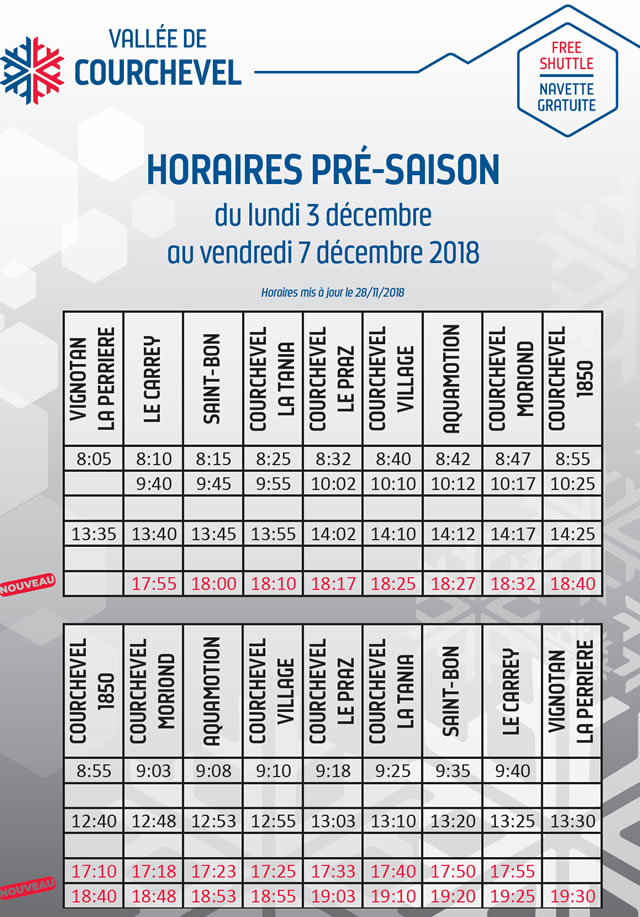 There’s an early bus departing La Tania at 08:30 to arrive in Courchevel 1850 for 09:00 then it is simply a 10 minutes past the hour service every hour from 09:10 to 01:10.