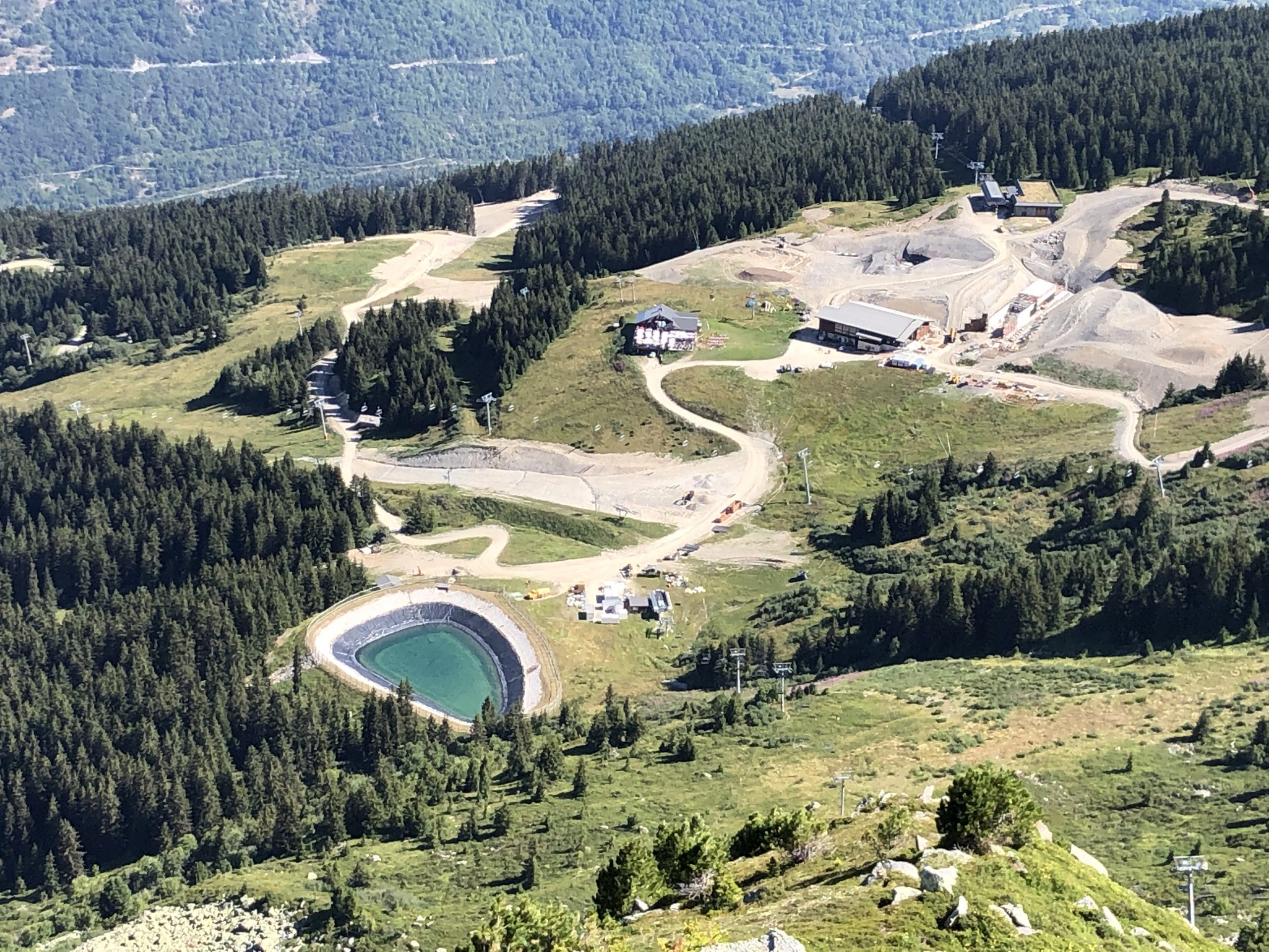 Looking down from Col de la Loze the extent of the work on the new tunnel under the World Cup piste near the La Tania Gondola Station can be seen.