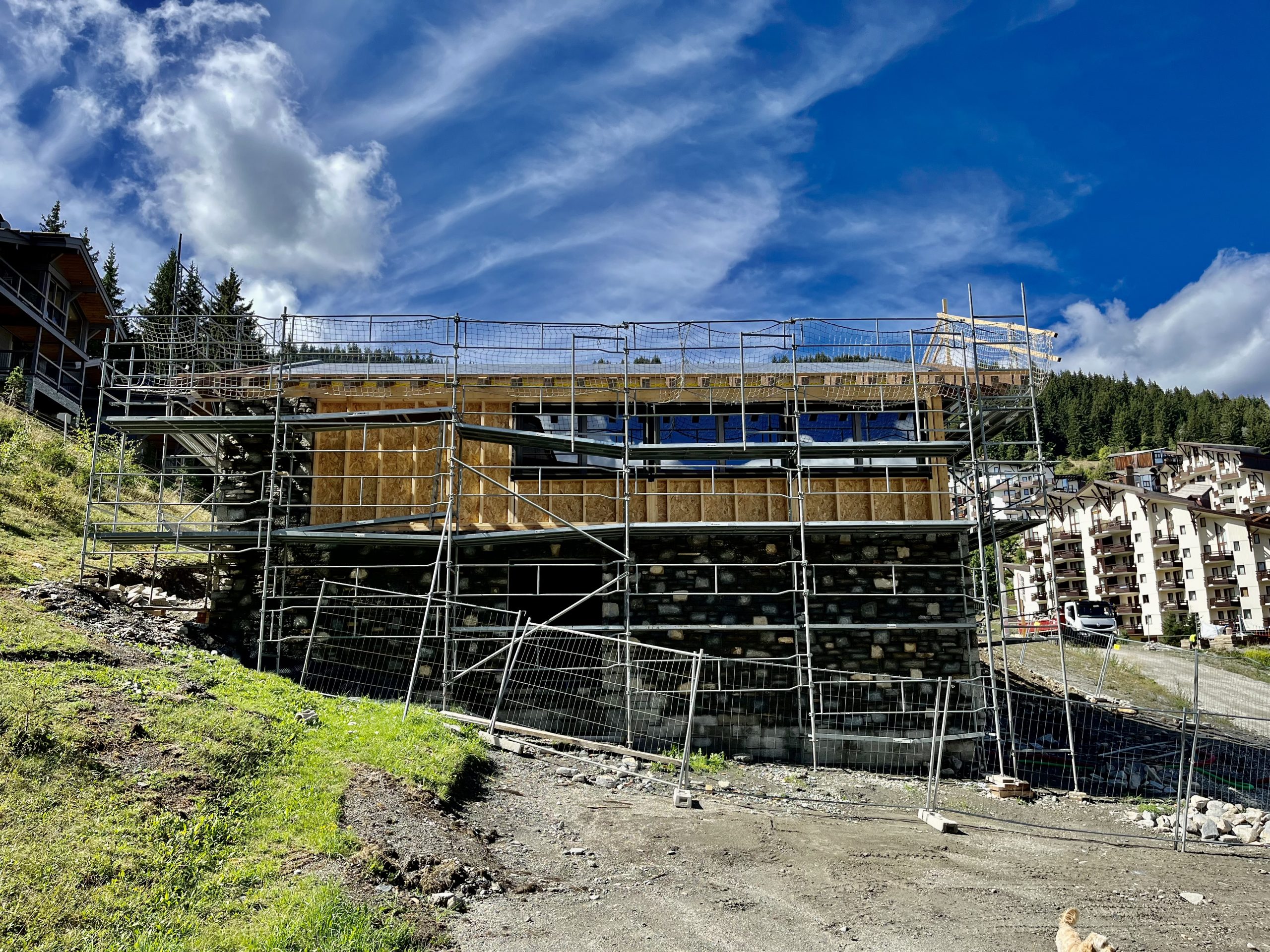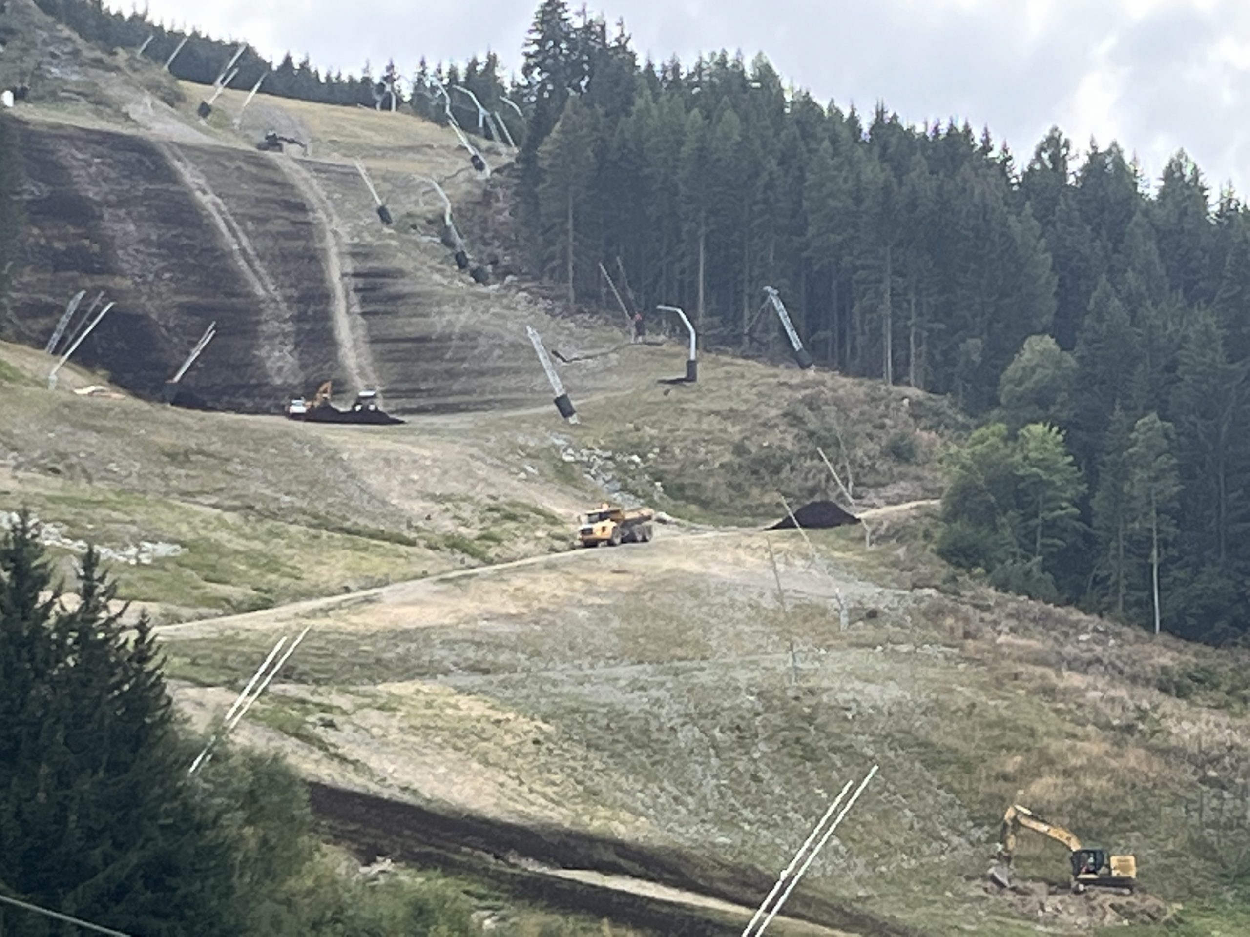 Fibre optic cabling going in to La Tania, the new car park compacted & stabilised, Le Farçon refurb (the kitchen at least), swimming pool resurfacing (again), Ferme / Snow Food work, surfacing / drainage / anti-erosion improvements around the gondola station, ESF Chalet approaching completion, roof work on Folyères Apartments and yet more piste work on L’Eclipse for the 2023 World Cup…