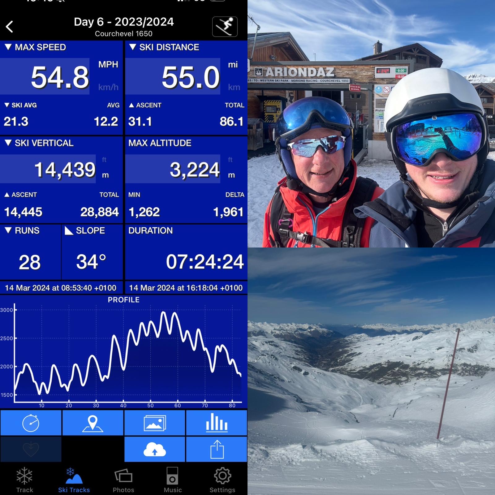 First lift start from Courchevel 1650. Completion was done despite significant queues at the major lifts at Le Masse and Val Thorens, also a serious accident in the 4th valley involving the chairlift being stopped for a helicopter rescue. 3rd photograph taken from one of the highest points in the route – Cime run coming back from Orelle.