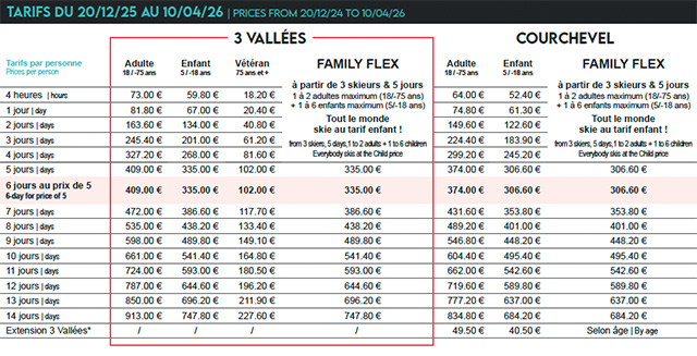 Courchevel Season Passes can be upgrade for a day with the 3V Extension (€49.50) for Winter 2026. The difference for an over 30 season pass is €230 so worth getting a 3V pass if going out of Courchevel more than 4 times during the season and paying the €49.50 daily extension rate.