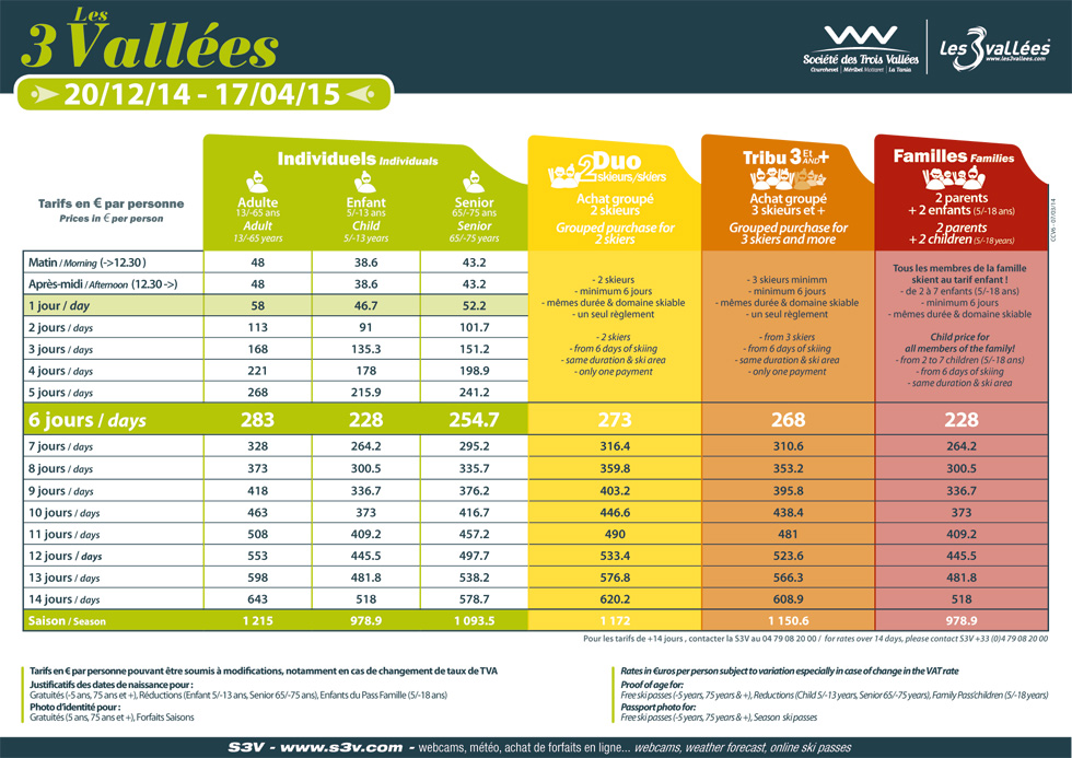 Introduced in the Winter 2012 / 2013 and continuing since is a discount if 3 are more passes of the same type, dates and duration (min 6 days) are bought together. The “Tribu” discount works out at around 6%. A 3 Valleys 6 day pass is €268 instead of €283 and it does include Season Passes so 3 x 3 Valley Season passes bought together would save €193.20 in total.